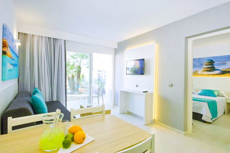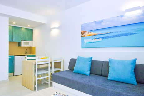 Este amplio y confortable apartamento ha sido diseñado para que disfrutes de una estancia perfecta. Dispone de un dormitorio independiente con dos camas, un luminoso salón con sofá cama y una práctica zona de cocina totalmente equipada con vitrocerámica de dos fuegos, nevera, microondas y kettle. Además, cuenta con baño privado y un balcón en todos los apartamentos, ideal para relajarte y disfrutar del entorno.